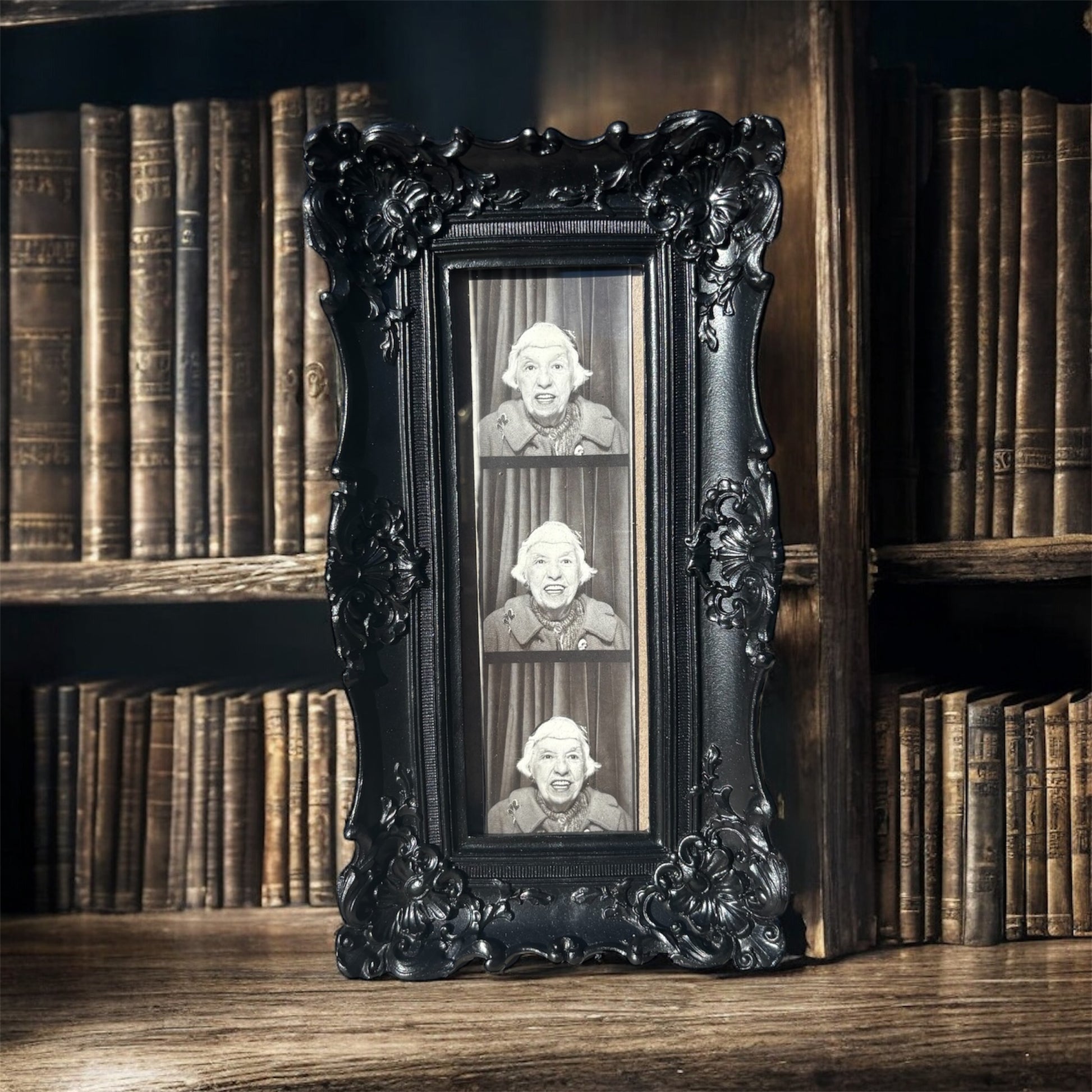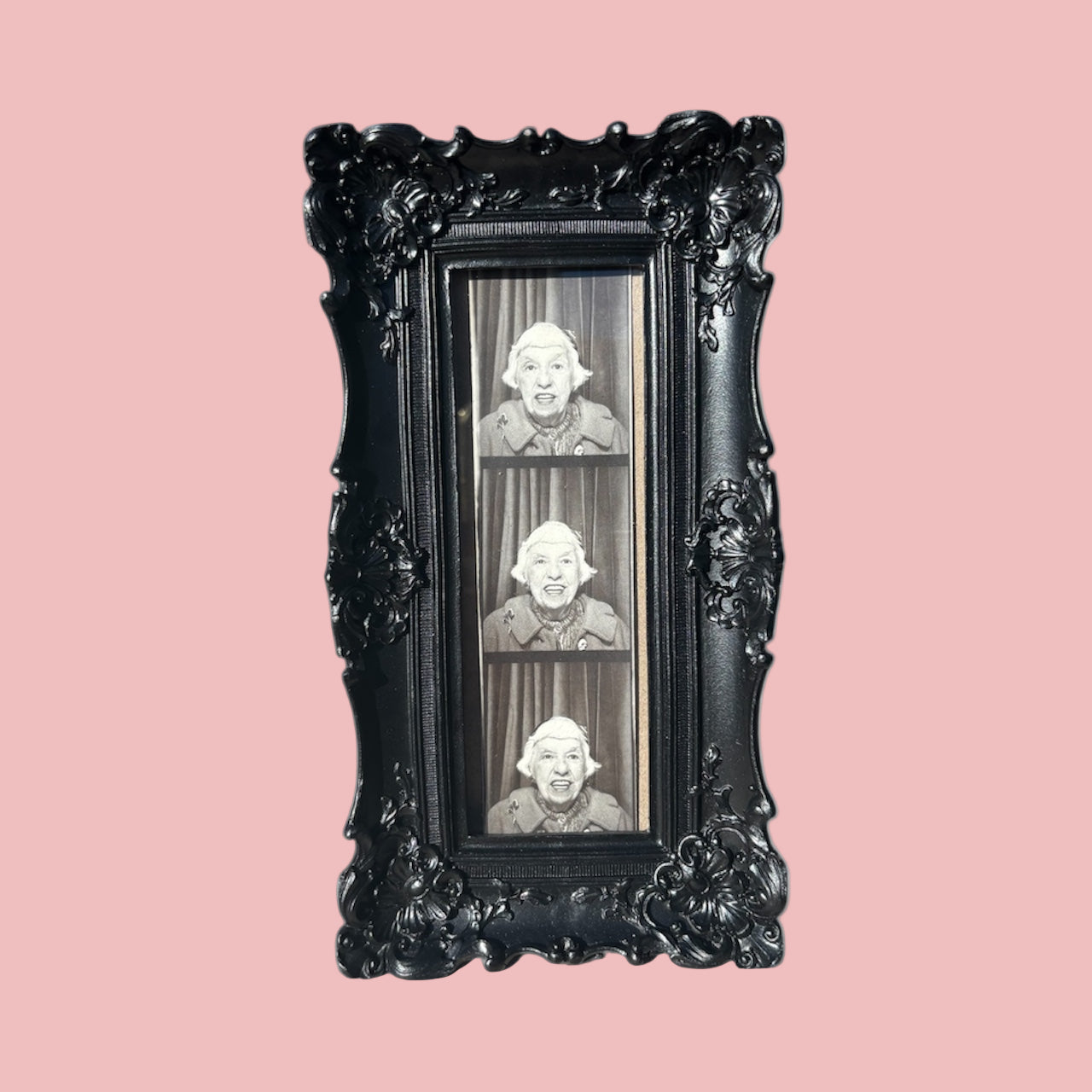 Capture your favorite moments in style with this charming ornate photo booth frame. Featuring an elegant black finish with intricate decorative details, it's the perfect way to display those candid snapshots and silly selfies. The sophisticated yet whimsical design adds a touch of je ne sais quoi to any space, making it an ideal keepsake for parties, events, or everyday memories. A delightfully chic way to celebrate life's fun moments!
